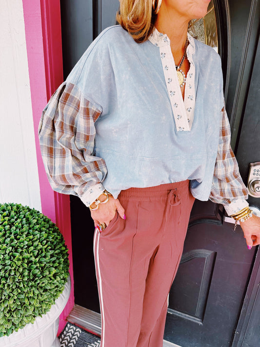 Denim Floral Trim Plaid Top
