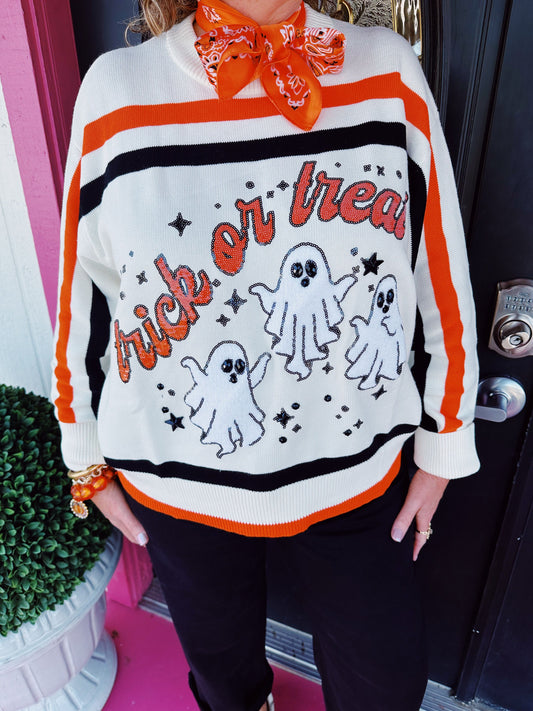 Sold outWhite Stripe Trick or Treat Sweater