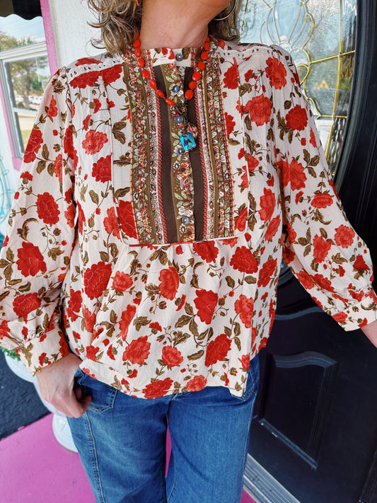 Sold outEcru Rust Floral Print Button Top