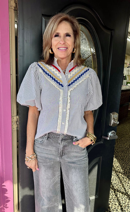 Grey Striped Puff Mixed Trim Top