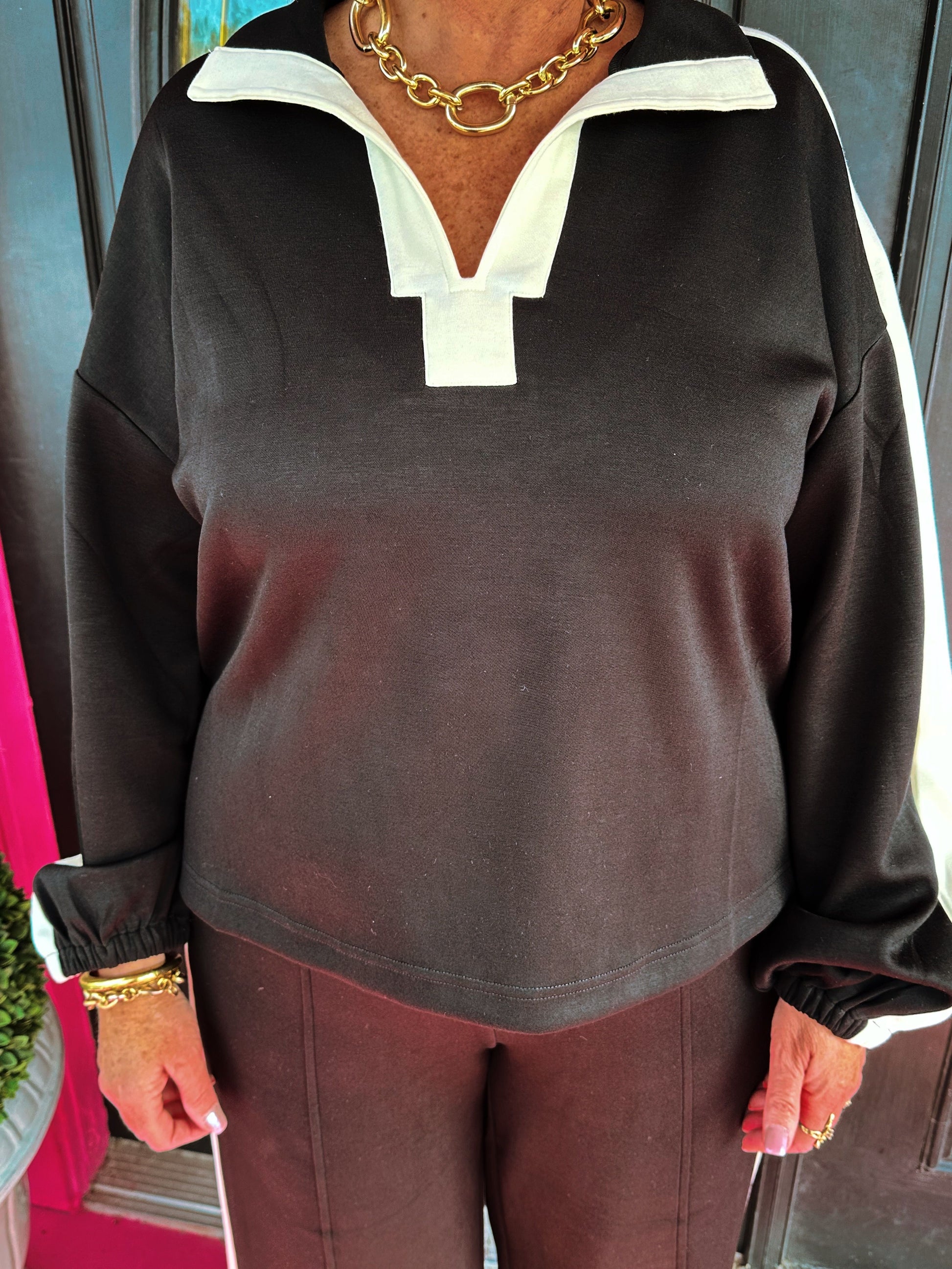 Get cozy and stylish with the Black Cream LS Pant Set! The long sleeve knit top features a fun contrast collar and sleeve stripes, plus side slits and elastic cuffs for extra comfort. The wide-leg knit pants come with a drawstring waist, side pockets, and matching stripe details with slit hems. Lightweight and non-sheer, this set is perfect for lounging or adding a playful touch to your casual look.