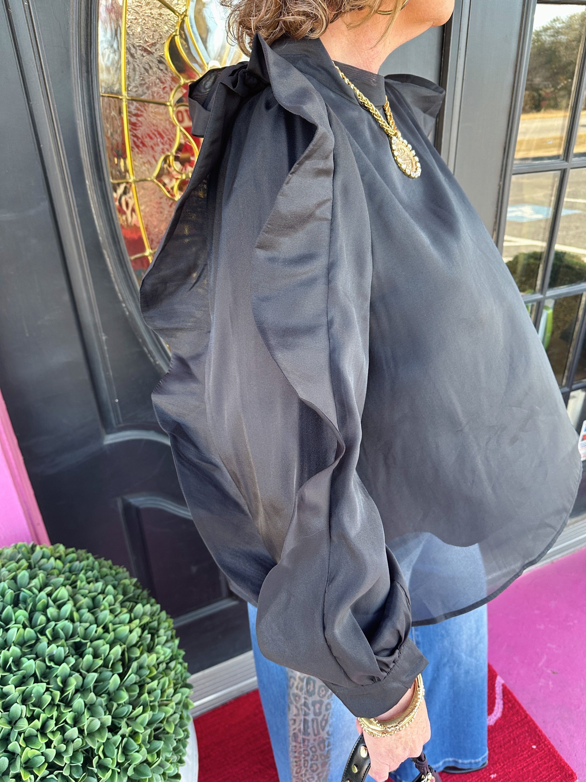 Elevate your wardrobe with this Black Jermaine LS Top—a playful piece that brings serious style to your everyday rotation. Crafted from 100% polyester for easy care and lasting wear, this top features charming ruffled and full sleeves that add movement and flair. The adjustable tie-back neckline lets you customize the fit to perfection, making it as versatile as you are. Whether you're dressing up for a night out or keeping it casual, this top is your go-to for effortless, trendy looks.