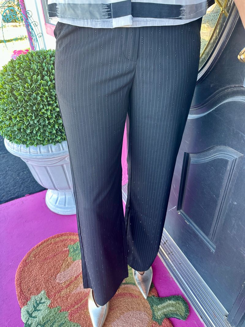 Meet your new favorite pants! The Black Pinstripe Sparkle Pant combines classic sophistication with a dash of glam. Sleek pinstripes are elevated with shimmering rhinestone details that catch the light just right. The flat front keeps things polished, while the leather waist with elastic back ensures all-day comfort and flexibility. Made from a luxe polyester, rayon, and spandex blend, these pants move with you and feel amazing. Whether you're heading to the office or a night out, this pair delivers style that sparkles without trying too hard.