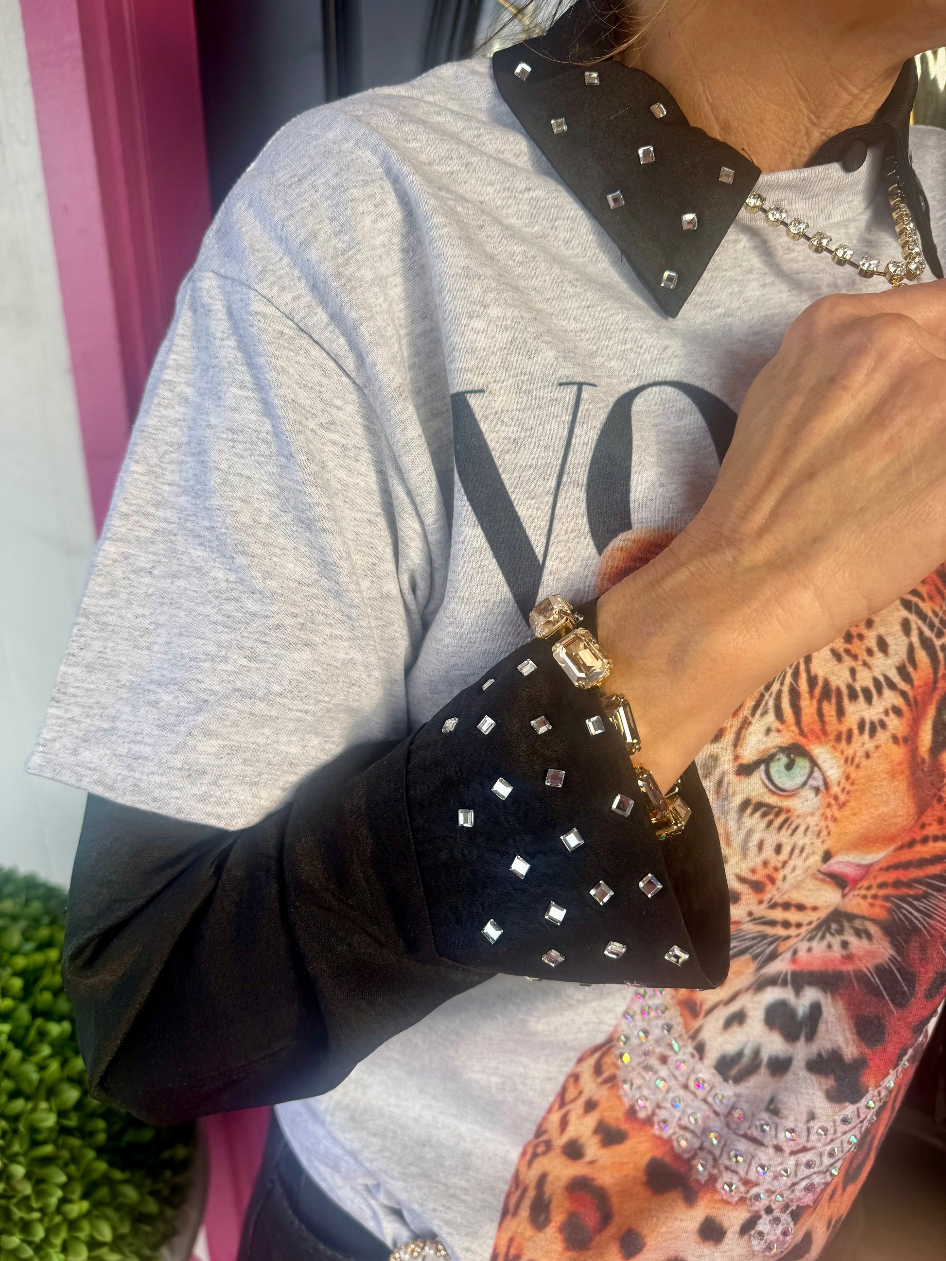 Black Studded Button LS Top