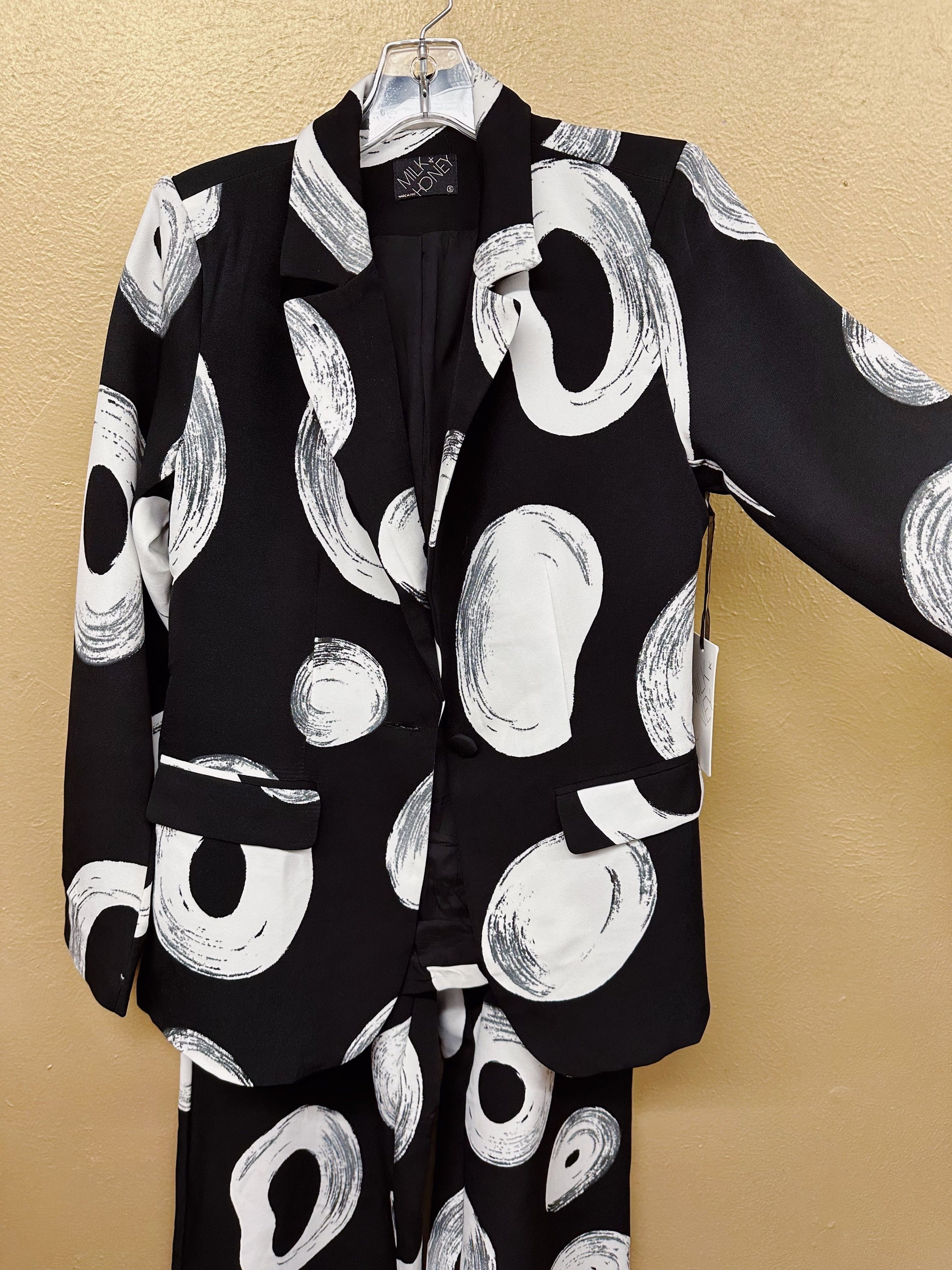Step into style and comfort with the Black White Printed Pant Set. Made from a stretchy blend of 95% polyester and 5% spandex, this pant suit features a bold black and white geometric print that’s sure to turn heads. Perfect for work or weekend, it combines playful pattern with a flattering fit for all-day confidence.