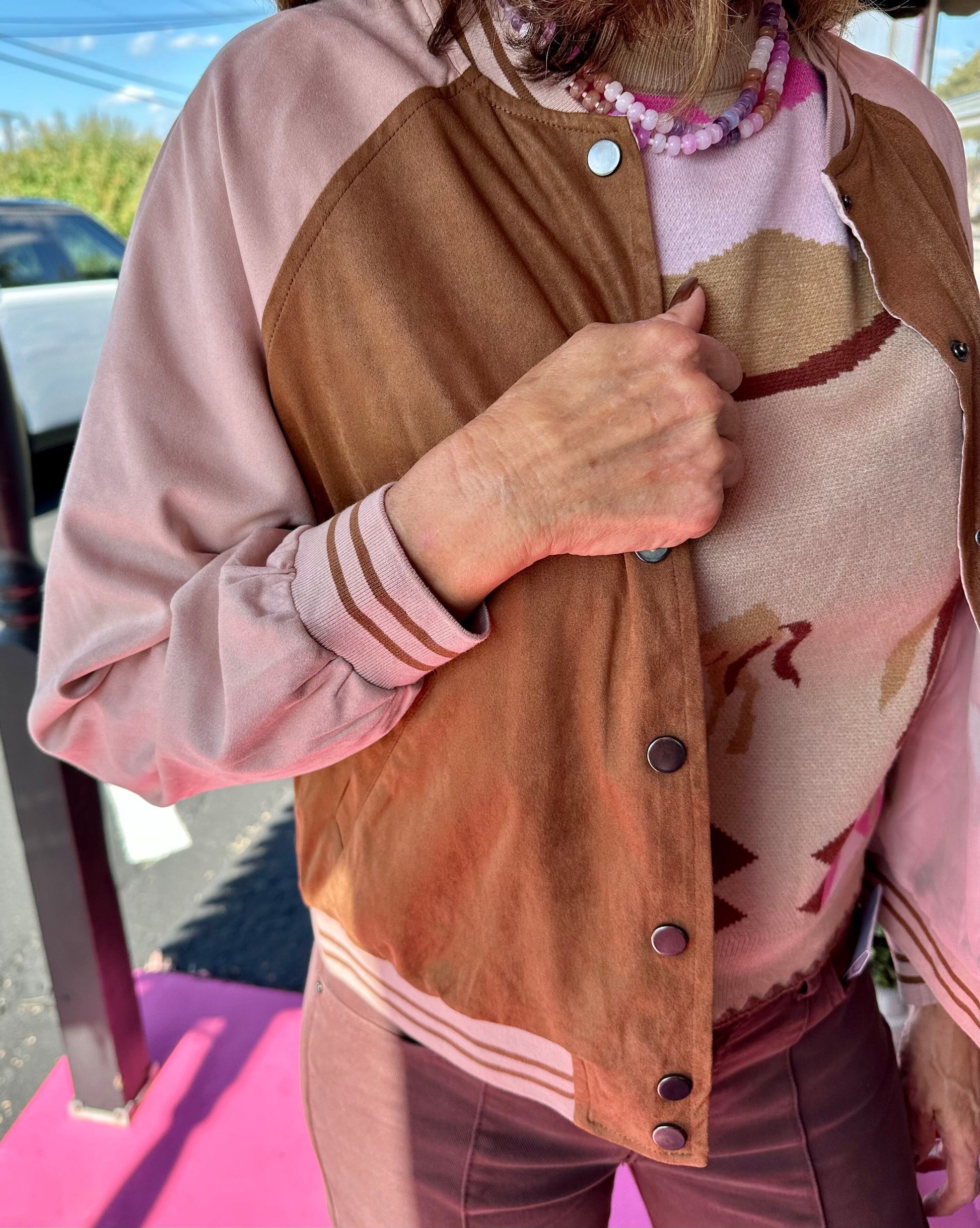 This playful suede baseball-style jacket combines a rich brown body with soft pink arms for a fresh, vibrant look. Crafted from 90% polyester and 10% spandex, it offers a comfortable stretch fit. Snap closures and handy pockets add practicality, while the delicate butterfly embroidery on the back brings a whimsical touch to your everyday style.