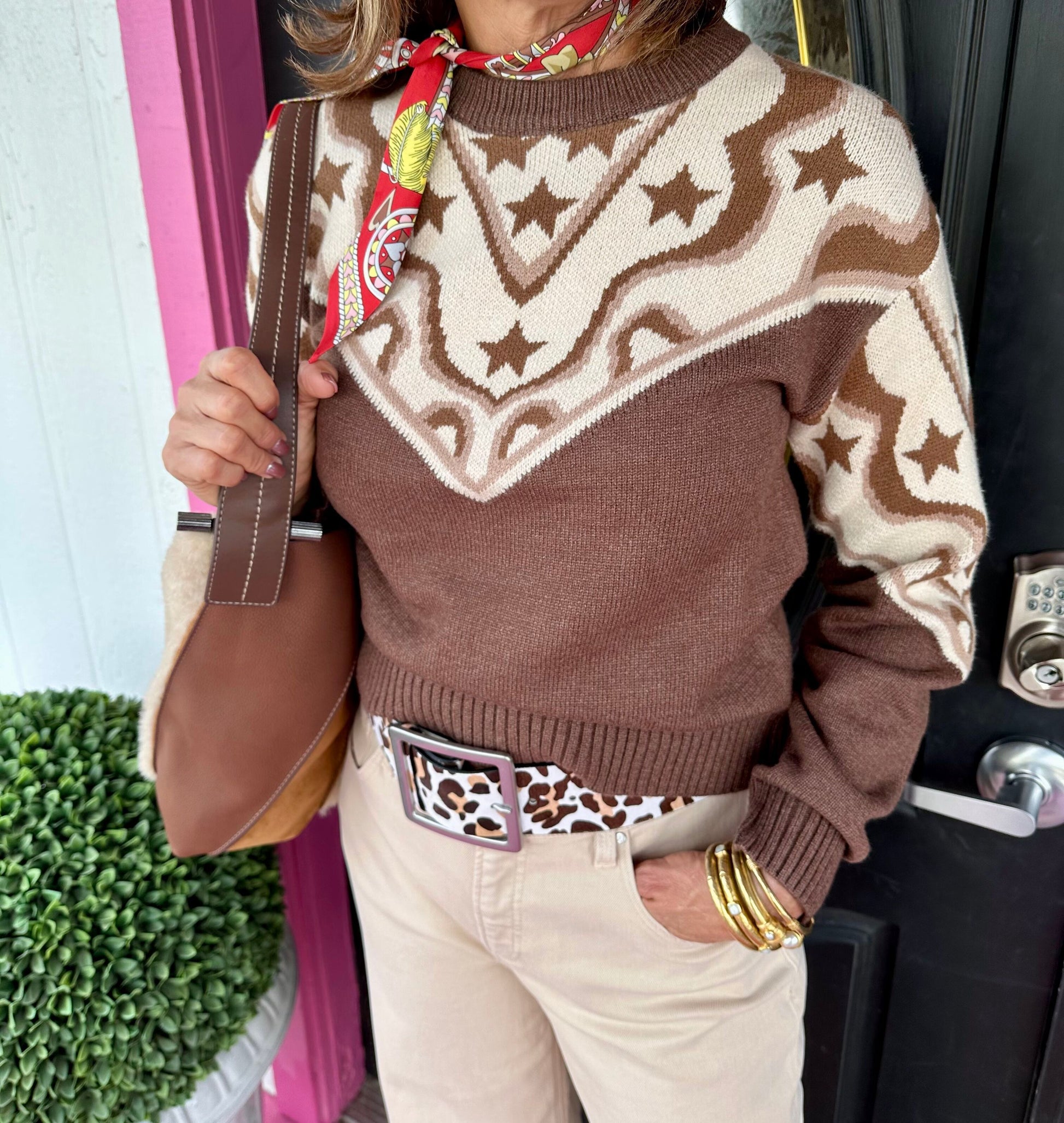 Brighten your day with the Brown LS Star Detail Sweater! Made from a cozy blend of 43% viscose, 32% nylon, and 25% polyester, this cream and brown crewneck features playful star accents that add a fun twist to your cozy look. Perfect for adding a little sparkle to your everyday style!