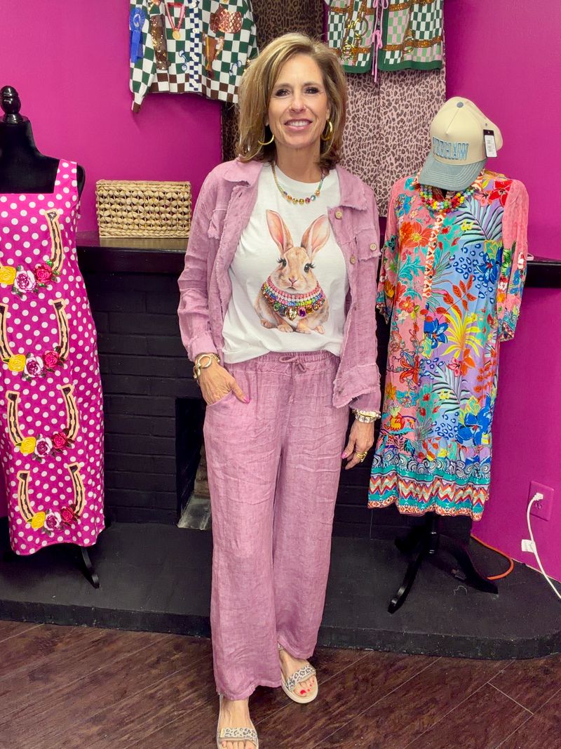 Soft 100% cotton short sleeve tee featuring an adorable bunny design with a sparkling rhinestone collar. Perfect for casual wear, this classic white tee combines comfort with playful style. The rhinestone details add a touch of glamour to an everyday essential.