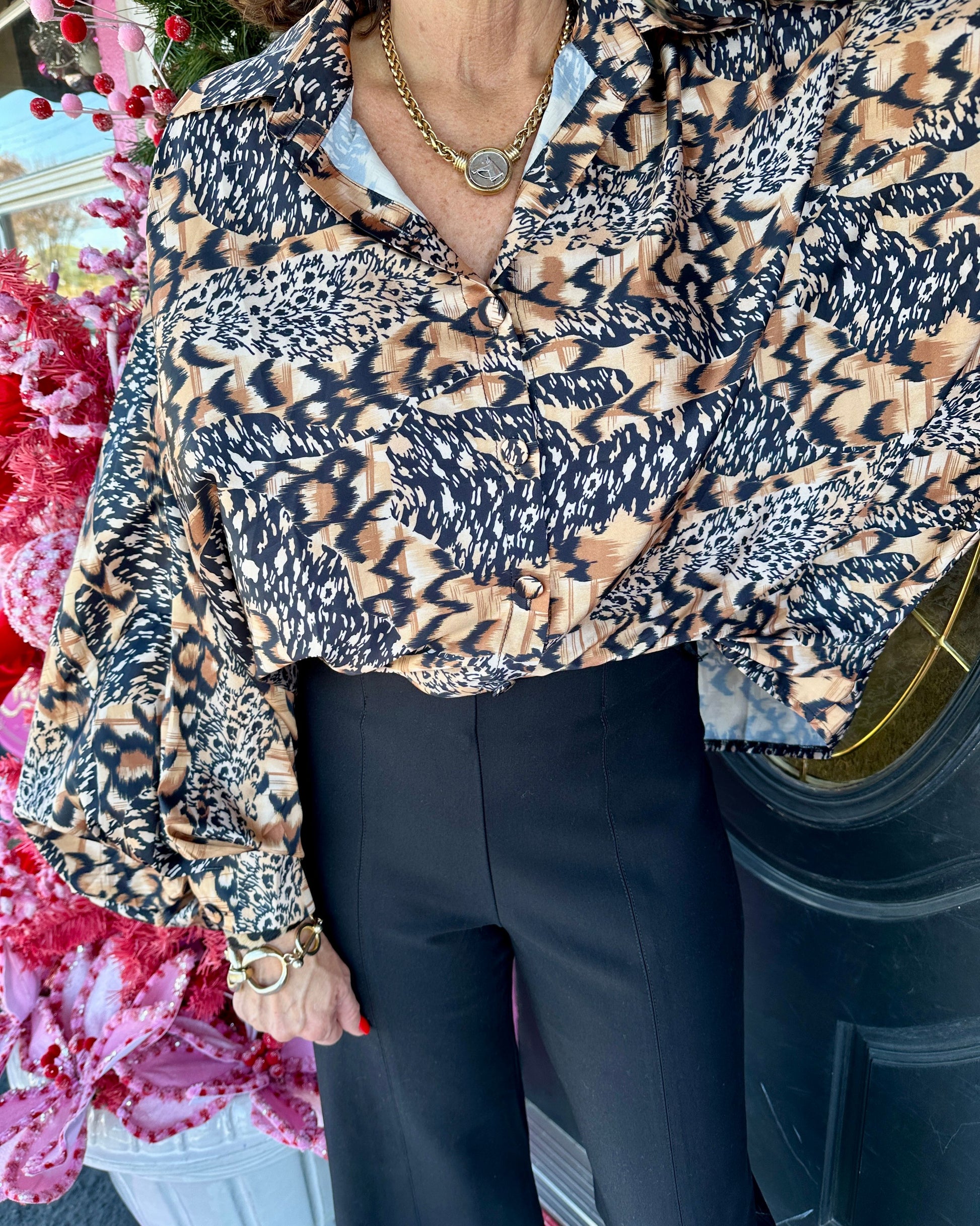Slip into effortless style with this oversized button-up top featuring a chic camel pattern that works with everything in your closet. Crafted from a comfortable cotton-polyester blend, it's got the perfect drape and durability for everyday wear. With a classic collar, full sleeves, and one-size-fits-most fit, this piece layers beautifully or stands solo as your new go-to casual essential. Cozy, versatile, and undeniably cool.