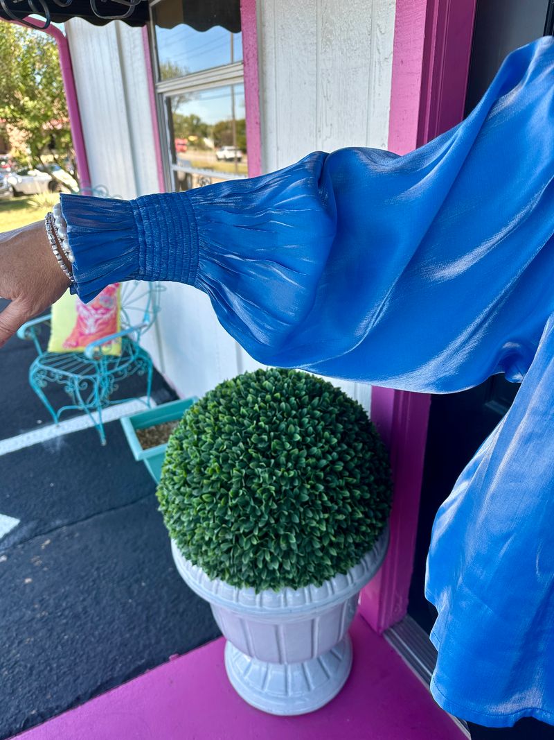 Introducing the Charlotte Metallic Sapphire Top—where elegance meets fun! This stunning piece showcases a rich sapphire blue that's both bold and versatile. Long sleeves provide coverage and sophistication, while the raised collar adds structure and polish. Gold buttons bring a touch of luxury and warmth to the design, and the pleated chest detail creates beautiful dimension and visual interest. Whether you're dressing for a special occasion or elevating your everyday look, this top delivers major style points with playful flair. A wardrobe essential that proves blue is always a brilliant choice!