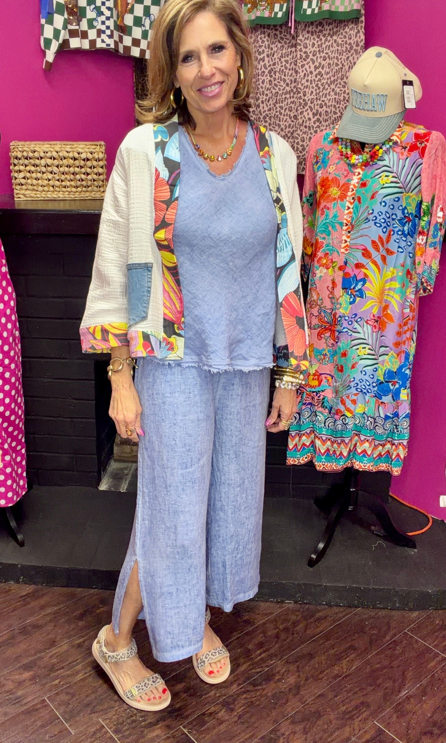 Effortless layering meets sustainable style with this 100% cotton short kimono jacket. Crafted from soft white gauze, it features a vibrant colorful trim border that adds visual interest to any outfit. Upcycled denim front pockets bring eco-conscious character, while a small decorative pocket on the back completes the design. Perfect for transitional seasons or as a lightweight cover-up over dresses and tees. One Size.