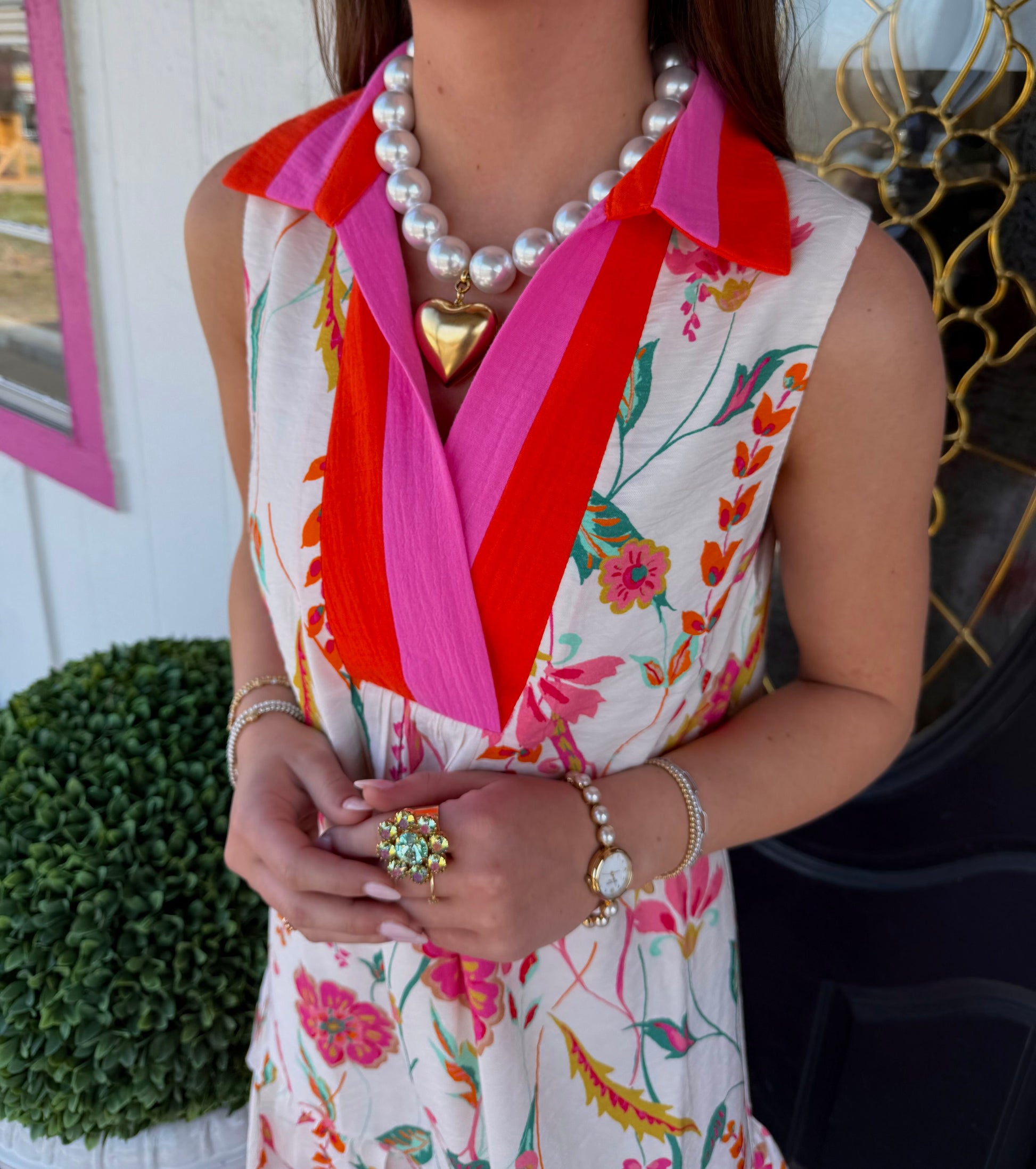 Cream Sleeveless Floral Dress This charming sleeveless dress features a vibrant floral pattern in green, pink, and gold blooms set against a soft cream background. The neckline and hem are trimmed with a striking orange and pink collar detail, while a playful ruffle adorns the bottom of the skirt for added movement and style. Crafted from a comfortable rayon and nylon blend with a lined interior, this dress offers both elegance and ease. Perfect for warm-weather occasions, garden parties, or casual outings where you want to make a colorful impression.