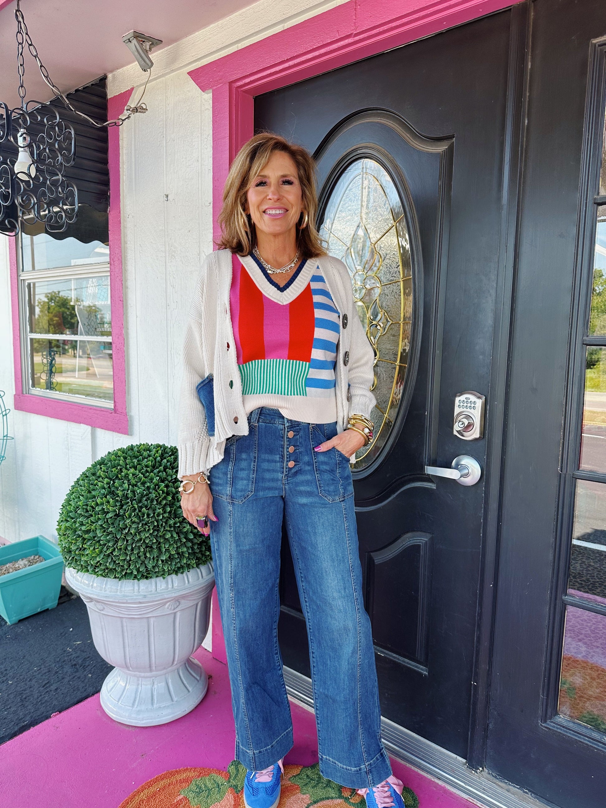 Add a burst of color to your wardrobe with this Cream Sleeveless Striped Knit Top. Made from a soft blend of 43% viscose, 32% nylon, and 25% polyester, it’s lightweight and comfy for all-day wear. The playful stripes and sleeveless design make it perfect for layering or wearing solo on sunny days.