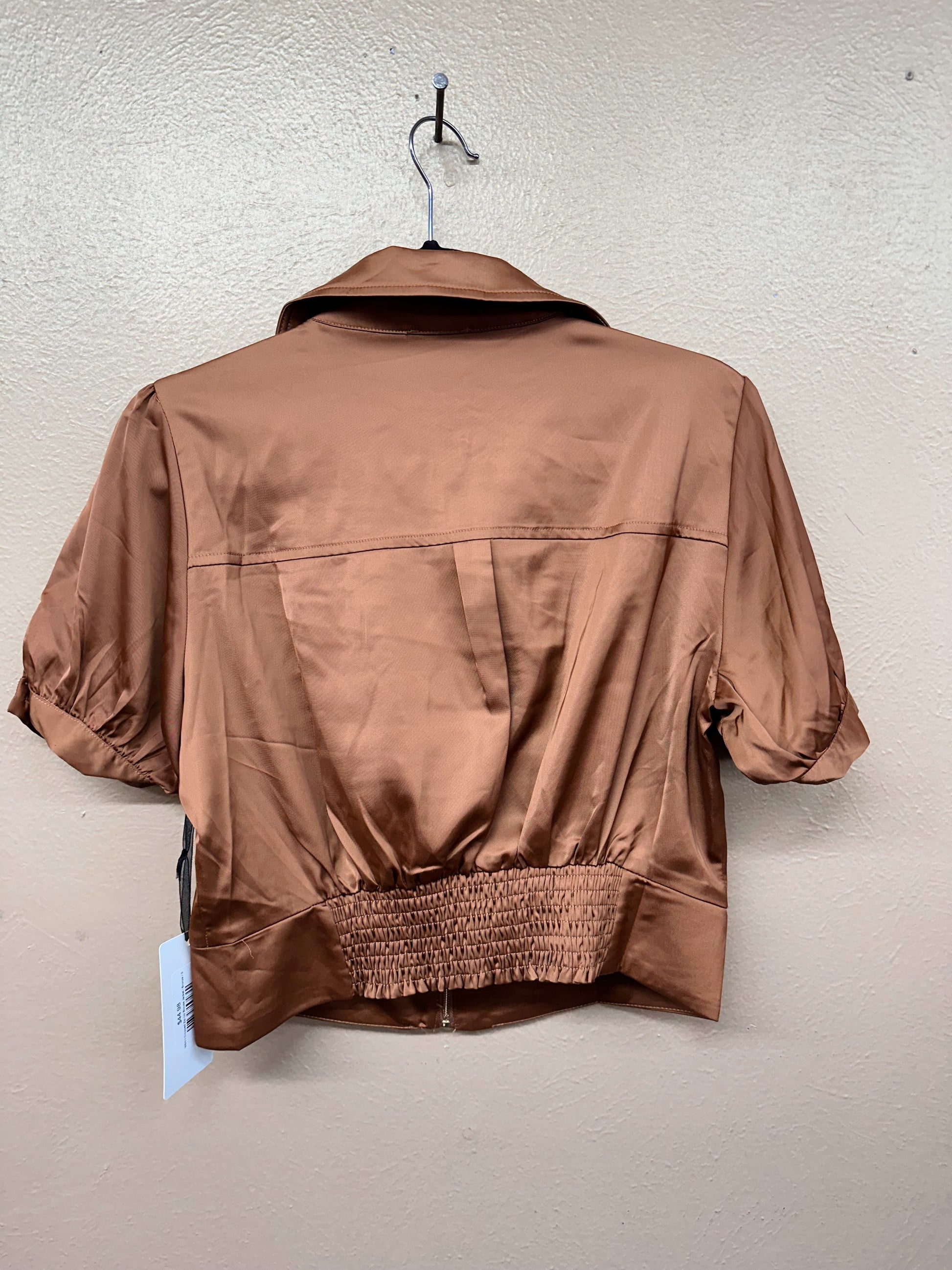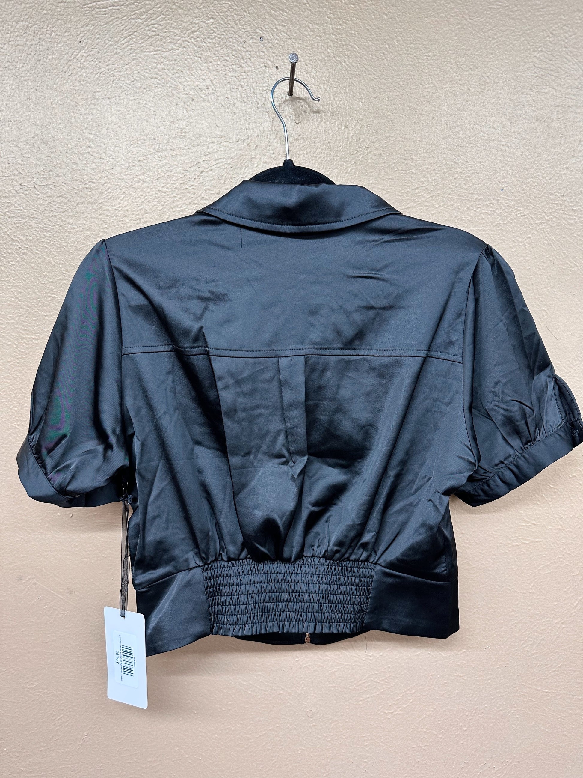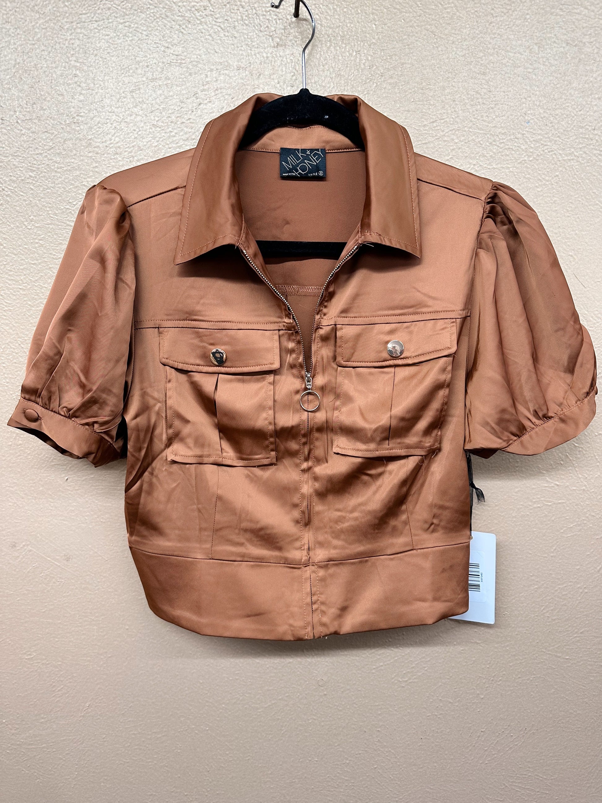 Add a little sparkle to your wardrobe with the Cropped Zip Up Blouse Jacket! Featuring a zip-front closure, playful short sleeves, and an elastic back waistband for comfort, this satin blouse-jacket shines with gold hardware details. Available in sleek black and rich bronze, it’s perfect for mixing bold style with easy wear.