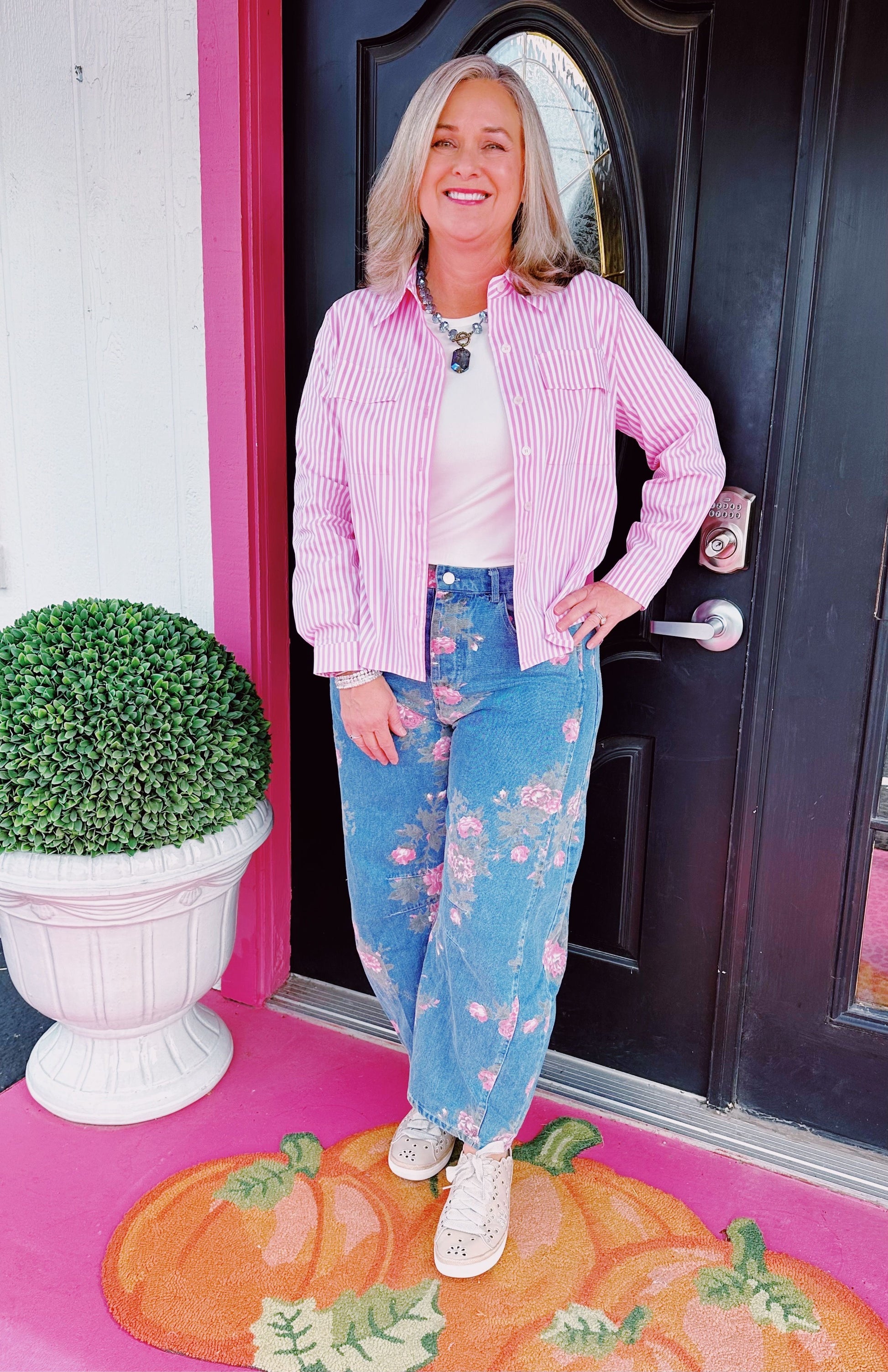 Step into spring all year round with the Denim Blossom Barrel Jean! These ankle-length jeans feature a fun pink flower pattern that adds a cheerful twist to classic denim. The button fly keeps things fresh and stylish, while the barrel cut offers a relaxed silhouette perfect for playful, easygoing days.