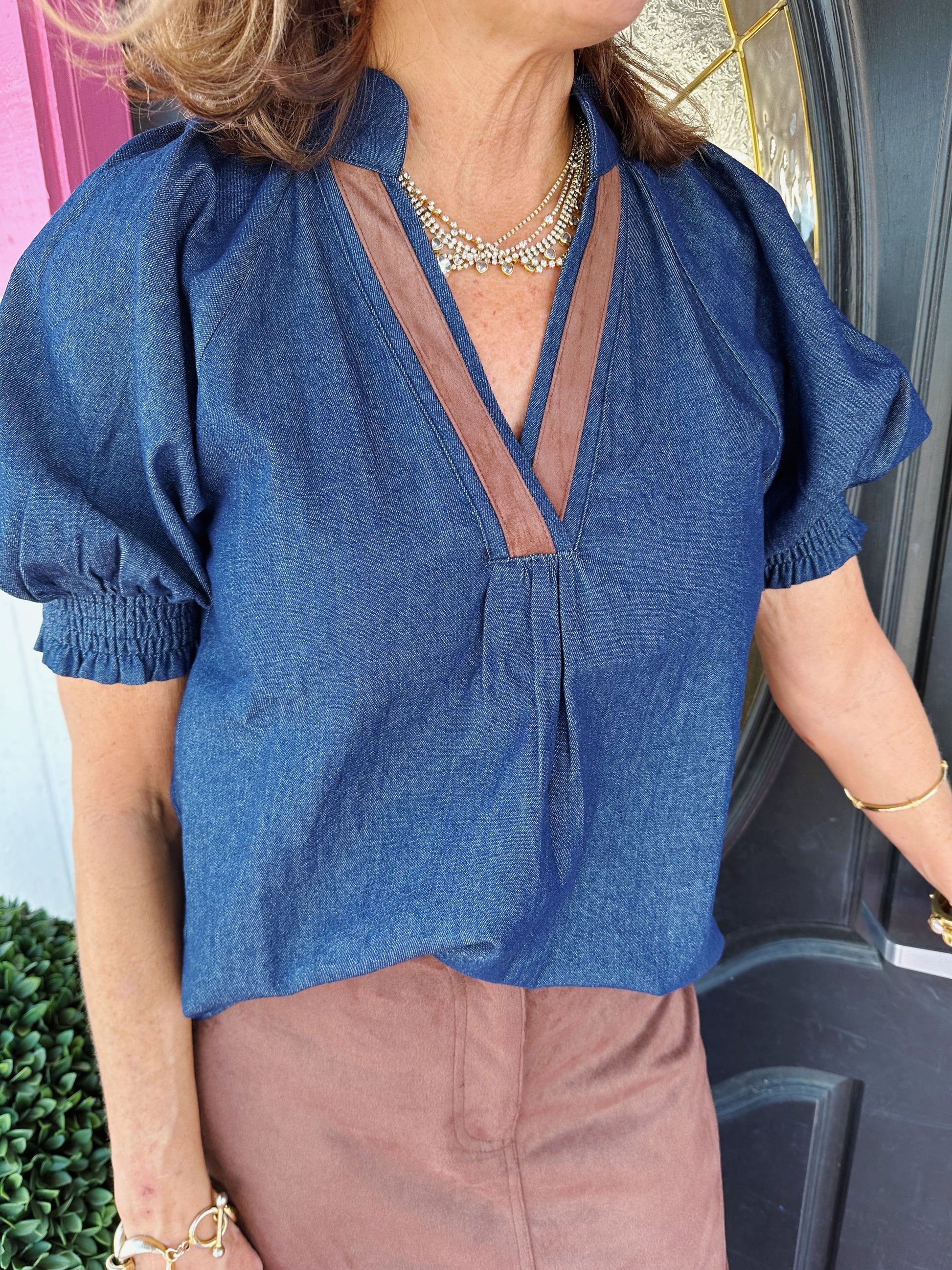 This Denim Brown V-Neck Trim Top brings playful flair with its puff sleeves and soft suede trim around the neckline. Made from 100% cotton, it’s breathable and comfy for all-day wear. The flattering V-neck adds a touch of sass, making it a perfect pick for casual outings or layering up in style.