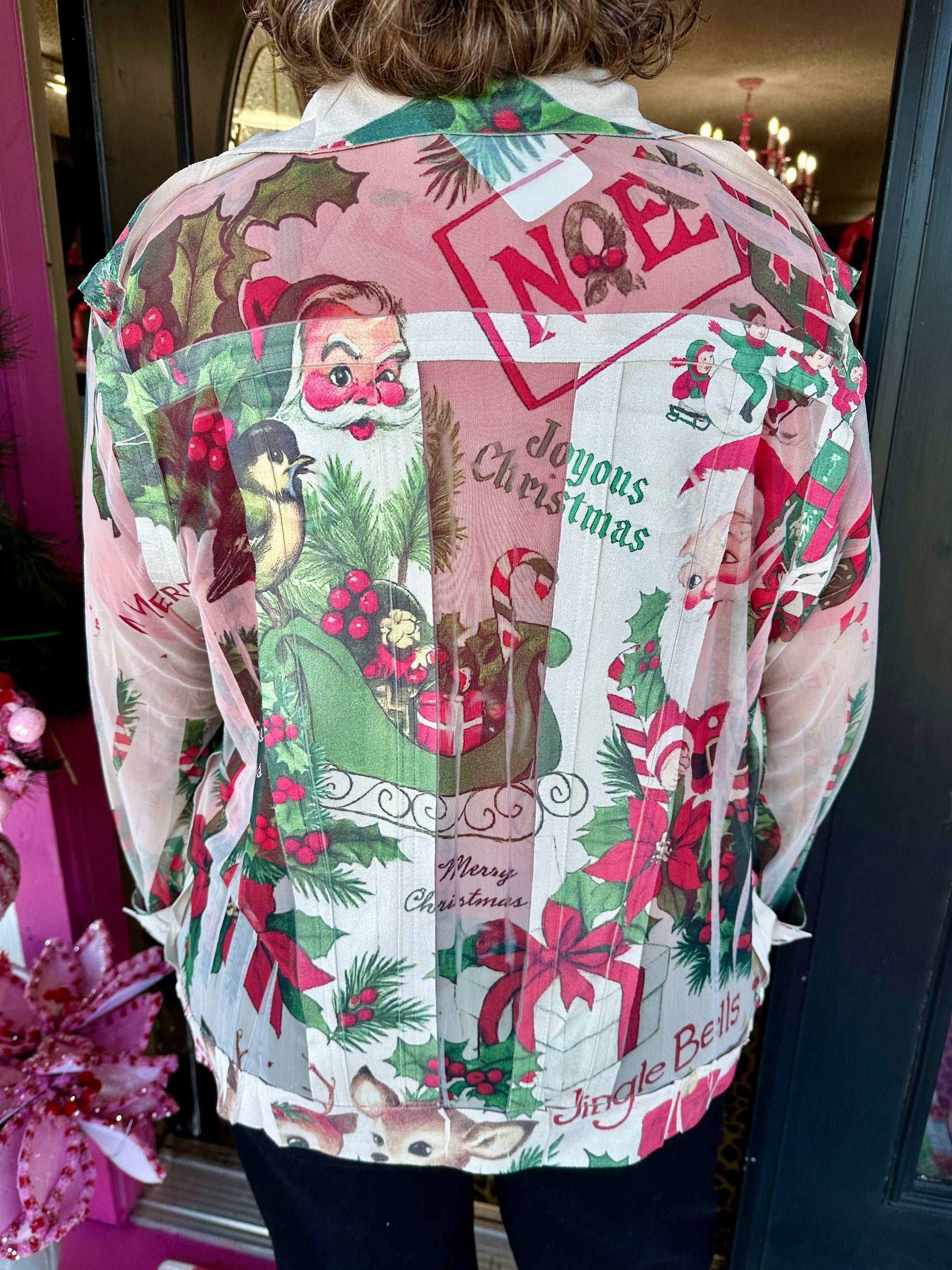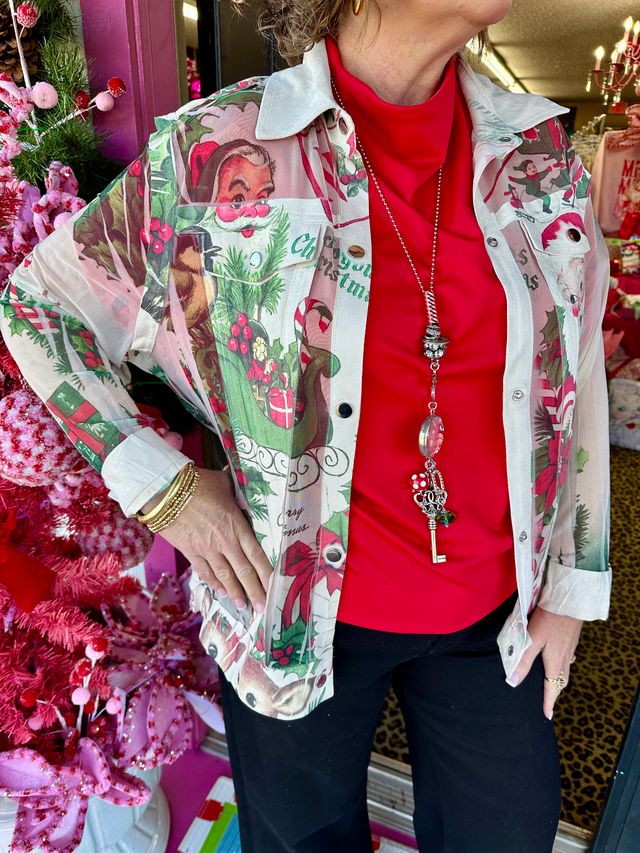 Get festive with this fun mesh and suede Santa print jacket! The playful holiday design brings instant cheer, while the mix of breathable mesh and soft suede creates a lightweight, comfortable layer. Shiny silver snap closures add a polished touch and make getting dressed a breeze. Perfect for spreading seasonal spirit or adding a whimsical pop to your everyday look, this jacket is your ticket to holiday vibes all year long!