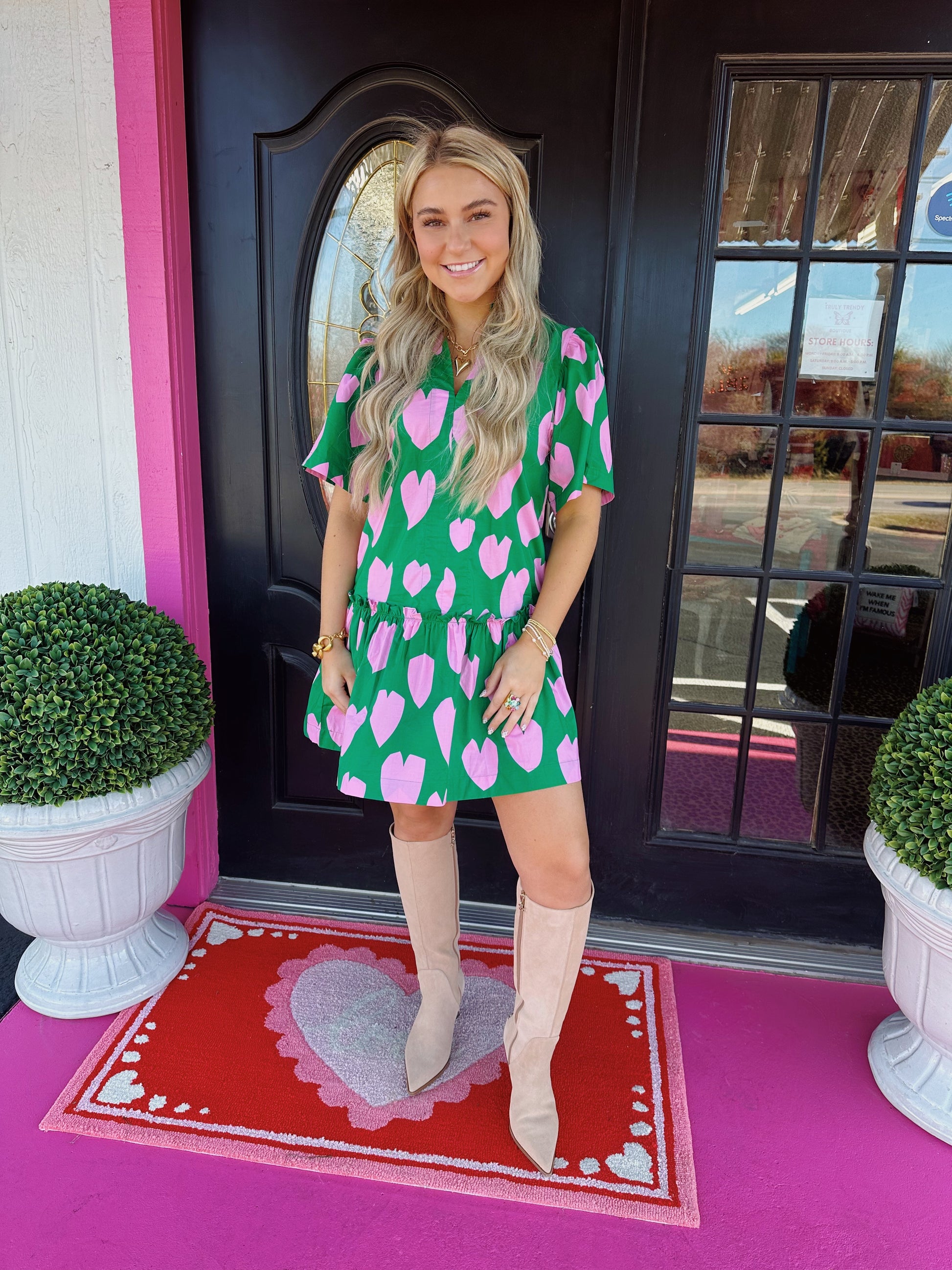 Add some love to your wardrobe with our Green/Pink Heart Print Mini Dress. Featuring a playful pink heart and flirty ruffled hem, this dress is perfect for any occasion. The v-neck adds a touch of elegance to this fun and quirky piece. Love at first sight guaranteed!