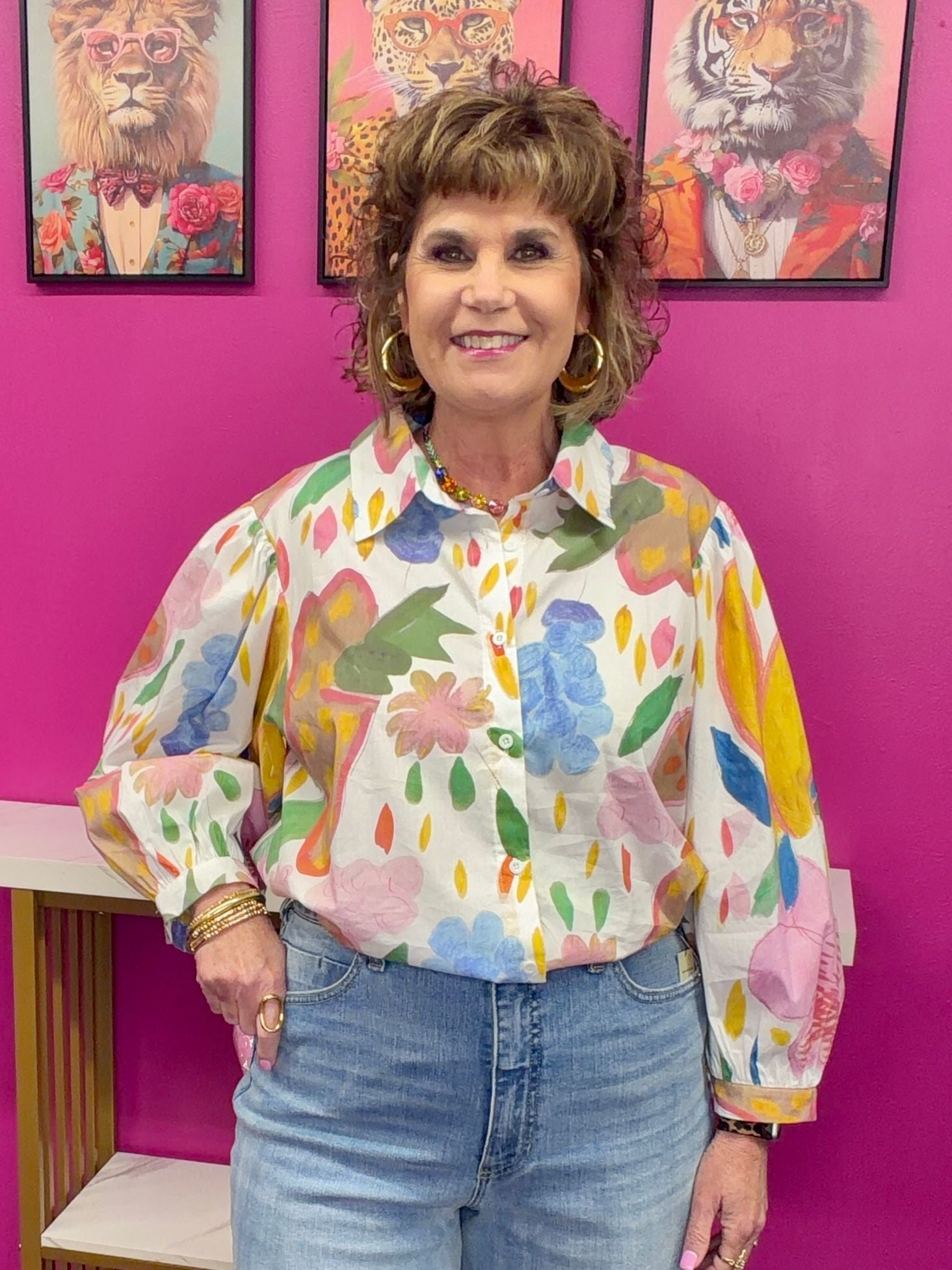 Effortless style meets comfort in this long sleeve button-down top. Featuring a crisp white background adorned with vibrant, modern floral print, it's a versatile piece that transitions seamlessly from casual to polished. The 5% spandex blend provides gentle stretch for all-day wearability, while side splits at the hem add contemporary flair and ease of movement. Perfect for layering or wearing solo, this top brings color and personality to any wardrobe.