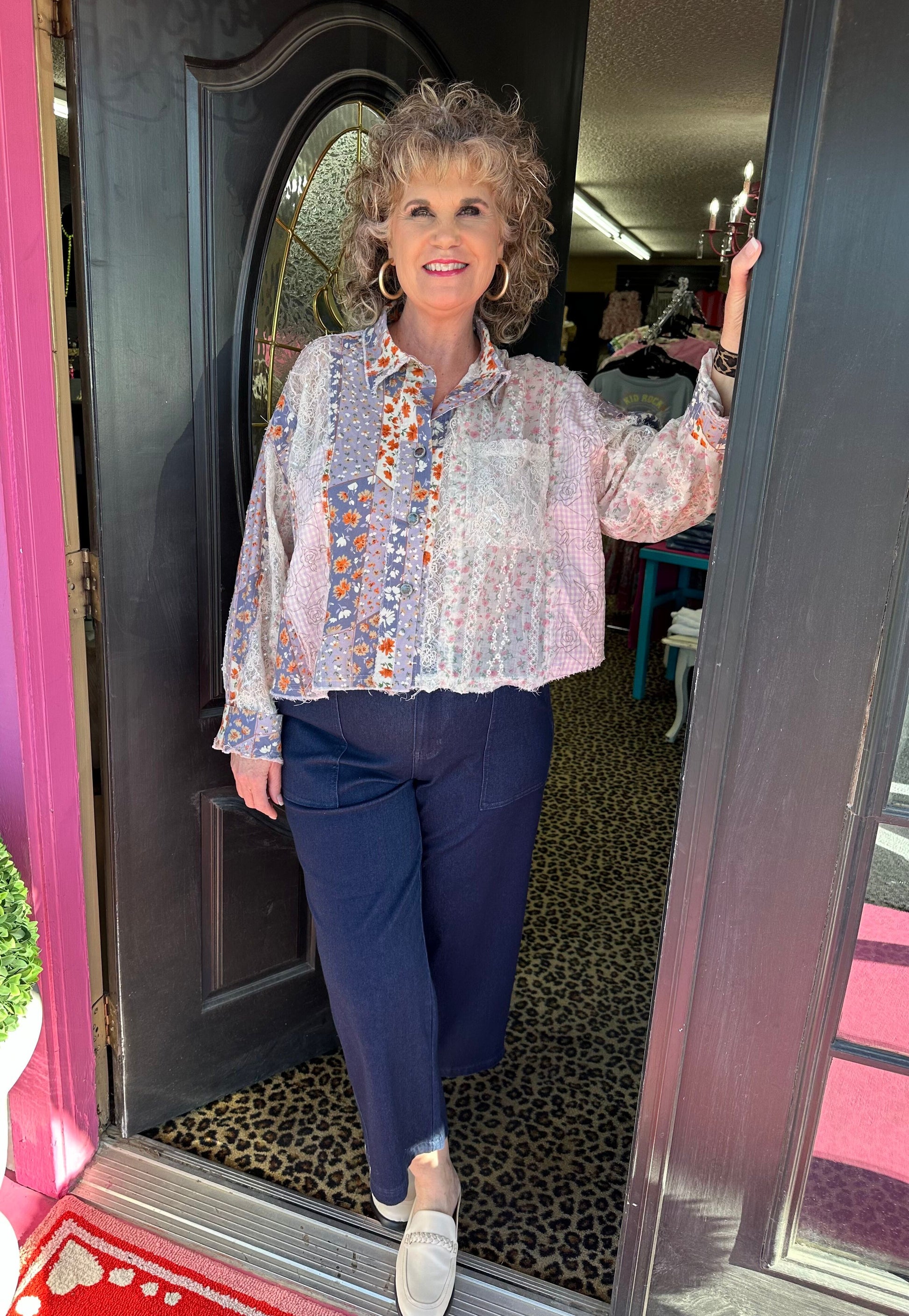 Floral and lace patches bring a playful twist to this collared, button down blouse. With long sleeves and a lavender hue, it's the perfect mix of chic and quirky. (Button it up and turn heads!)
