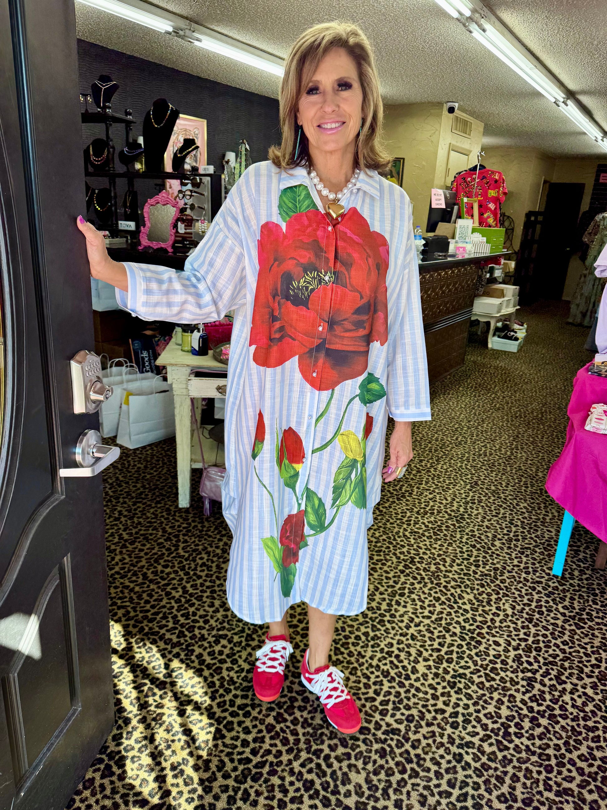 Slip into easy, breezy style with this Light Blue Stripe Maxi Dress. Featuring a playful button-up front and a one-size-fits-all design, it’s perfect for your vacation or travel adventures. Adorned with sweet rose details on both front and back, this dress adds a fun, flirty touch wherever you go. Comfortable, stylish, and effortlessly charming – your new go-to for getaways!
