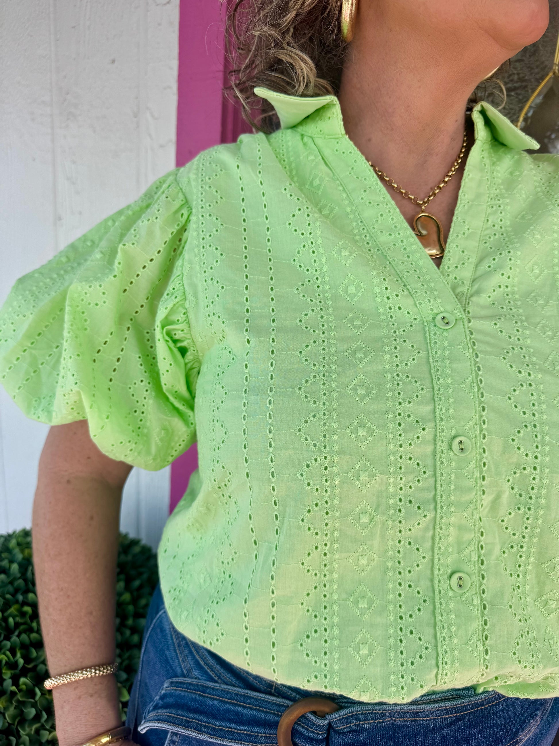 The Lime Eyelet Embroidery Blouse by Pinch is a unique blend of playful and sophisticated. Made with 100% rayon, this button-up blouse features puff elastic sleeves for a touch of whimsy. Perfect for adding a pop of color to any outfit.