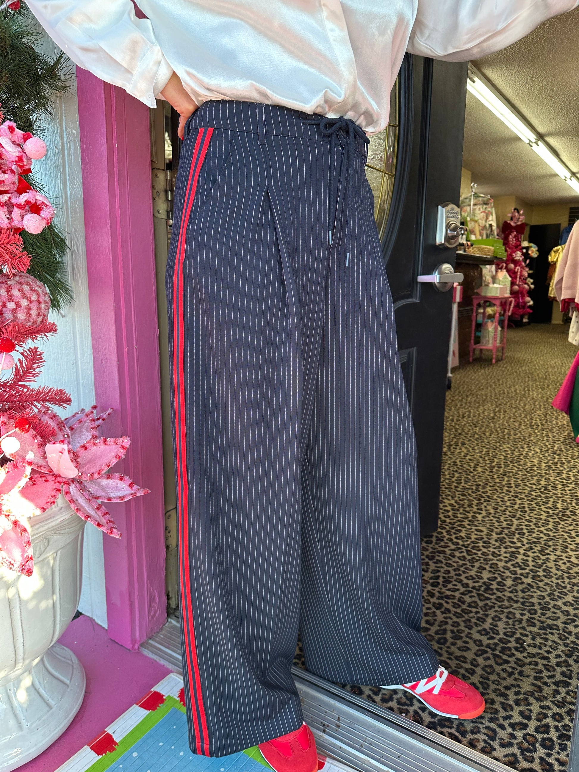 Turn heads in these sophisticated wide-leg trousers that pack serious style! Navy pinstripes meet a cheeky red ribbon accent running down the side—a playful twist on classic tailoring. Crafted from a silky viscose, polyester, and elastane blend, they drape beautifully while keeping you comfortable. Pleated front, functional pockets, and a zip-button closure with drawstring waist ensure a flattering fit that works from office to evening out. These trousers prove that timeless elegance doesn't have to be boring!