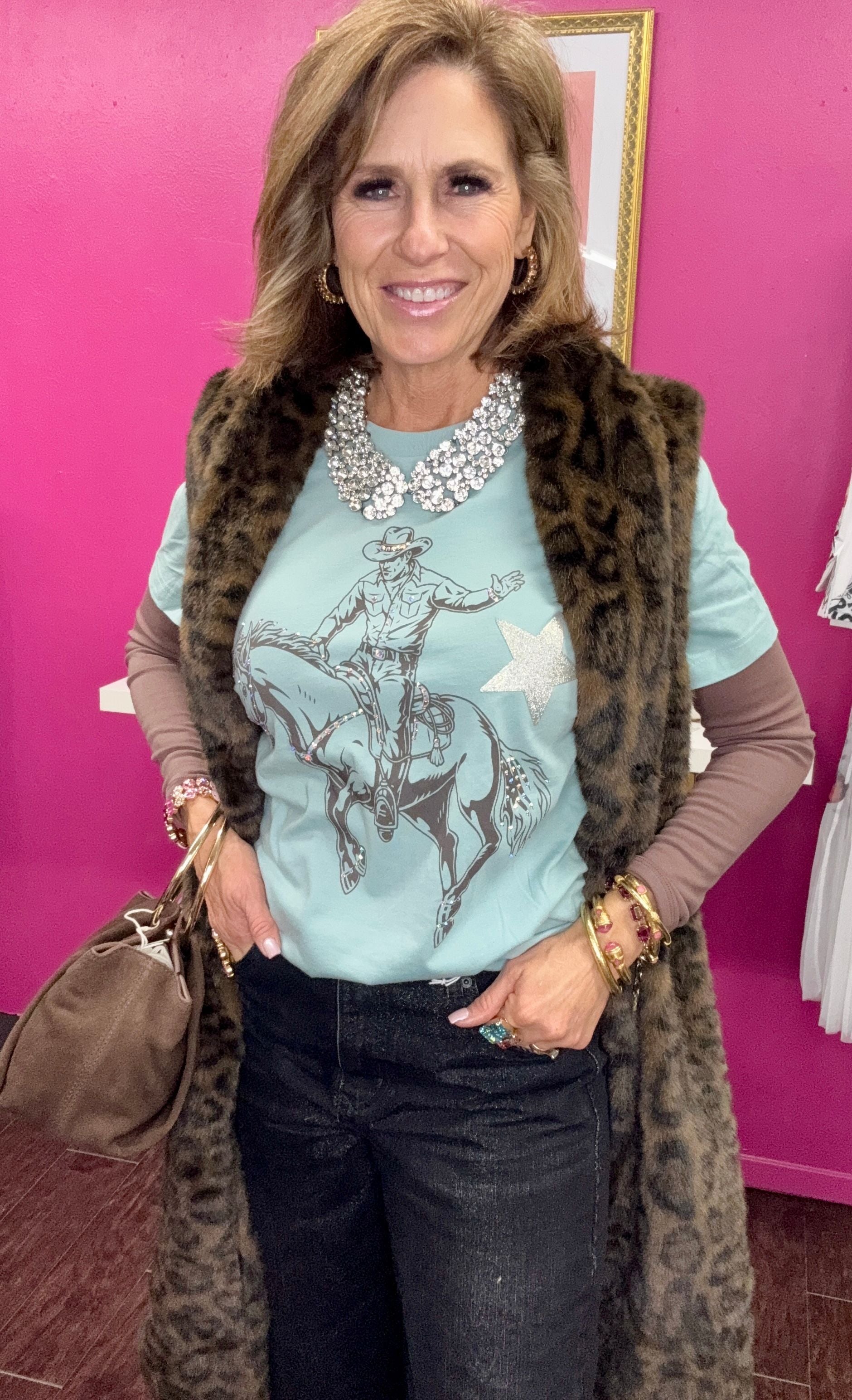 Strike a pose in this Mint Brown Bling Star Cowboy Tee! Soft cotton in a cool mint blue-green shade provides the perfect canvas for this western-inspired design featuring a rugged cowboy paired with a striking silver star applique. Rhinestone sparkles dance across the entire design, bringing serious shimmer and sass to your wardrobe. Ideal for trendsetters who crave that perfect blend of cowboy cool and glittery glamour. Comfort meets showstopping style in this must-have tee.