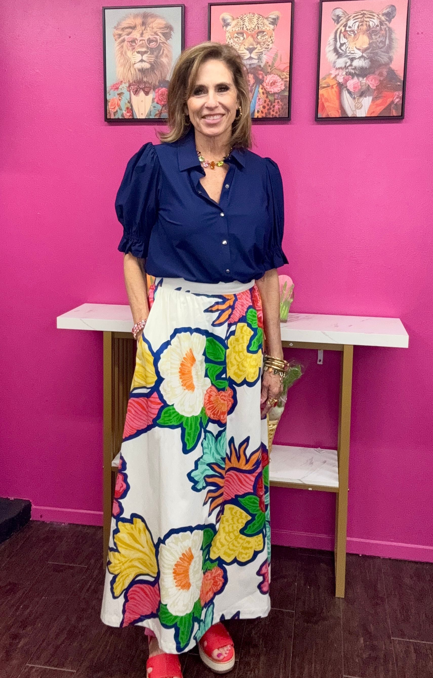 Effortless elegance meets comfort in this navy button-down top. Crafted from a breathable 76% nylon and 24% elastane blend, it offers stretch and durability for all-day wear. The charming puff sleeves add a touch of vintage-inspired style, while the classic collar and button-front closure make it versatile enough for casual outings or layered looks. Perfect for mixing into your everyday wardrobe.