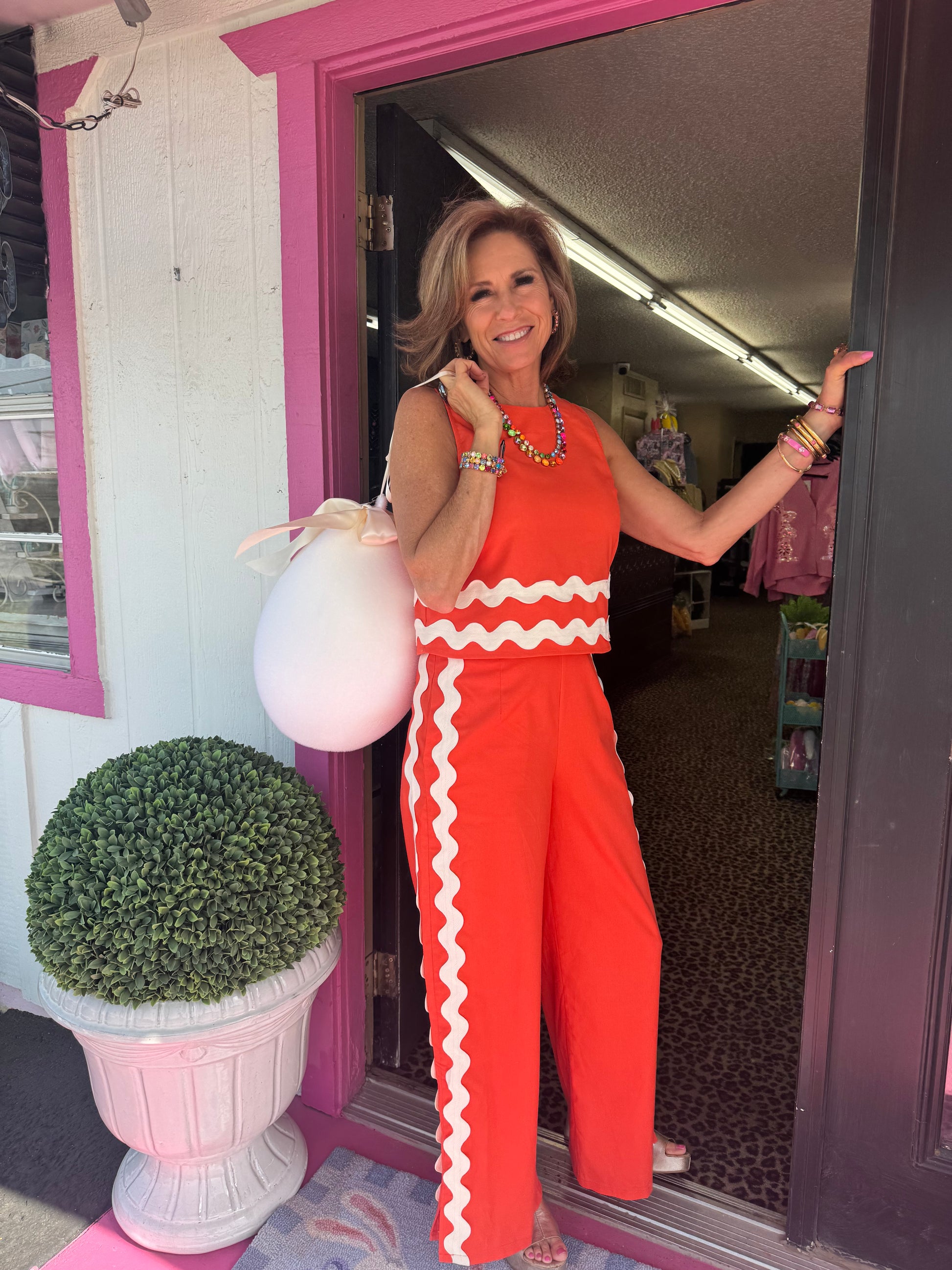 Get ready to have some fun in our Orange Rick Rack Detail Pant Set! Featuring a sleeveless top and wide leg pants, this set is perfect for any playful personality. This unique design is a Pinch brand, making it a must-have for those who don't take themselves too seriously. A fun and stylish addition to your wardrobe!