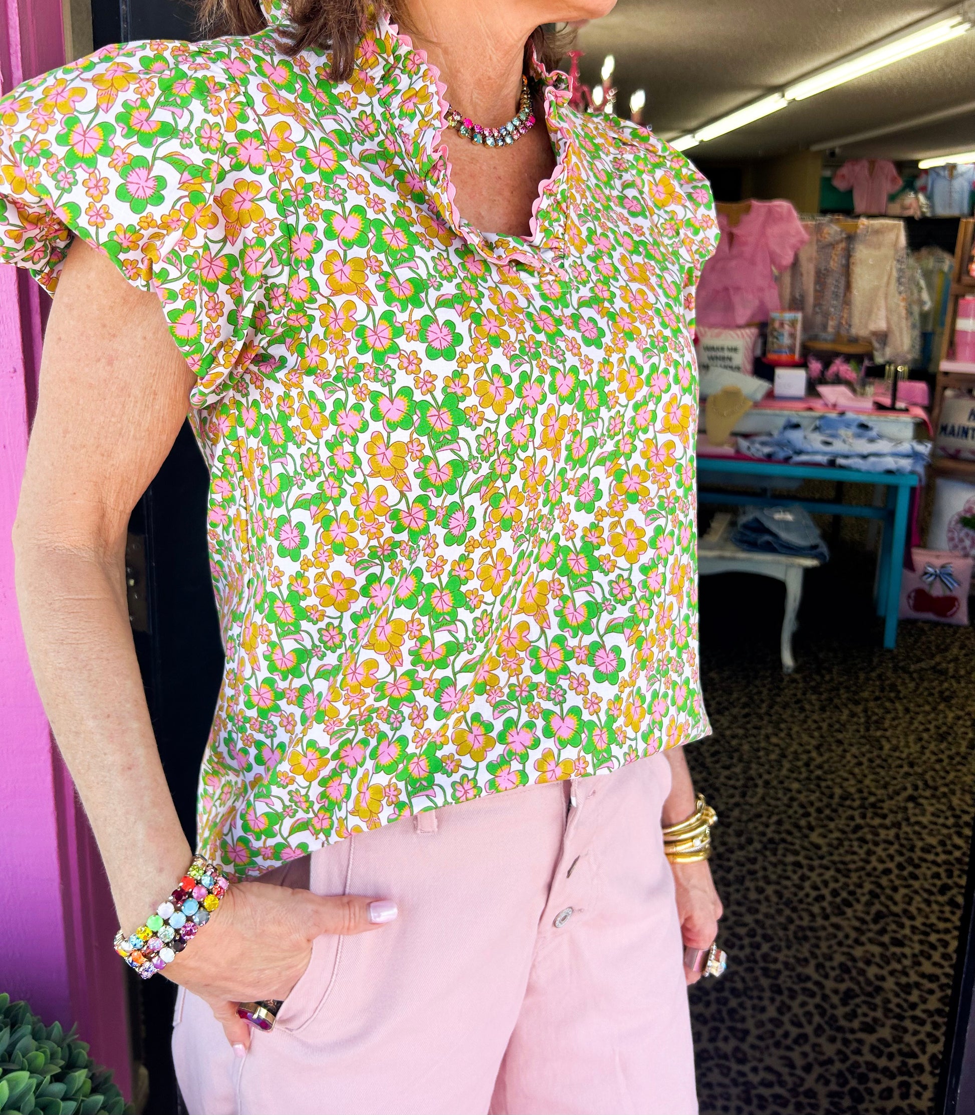 Introducing the Pink Clover Popover! With a playful pink and green clover design, ruffled collar, and puff short sleeves, this v neck top is perfect for adding a touch of whimsy to any outfit. Bring some luck to your wardrobe with this quirky and fun piece!