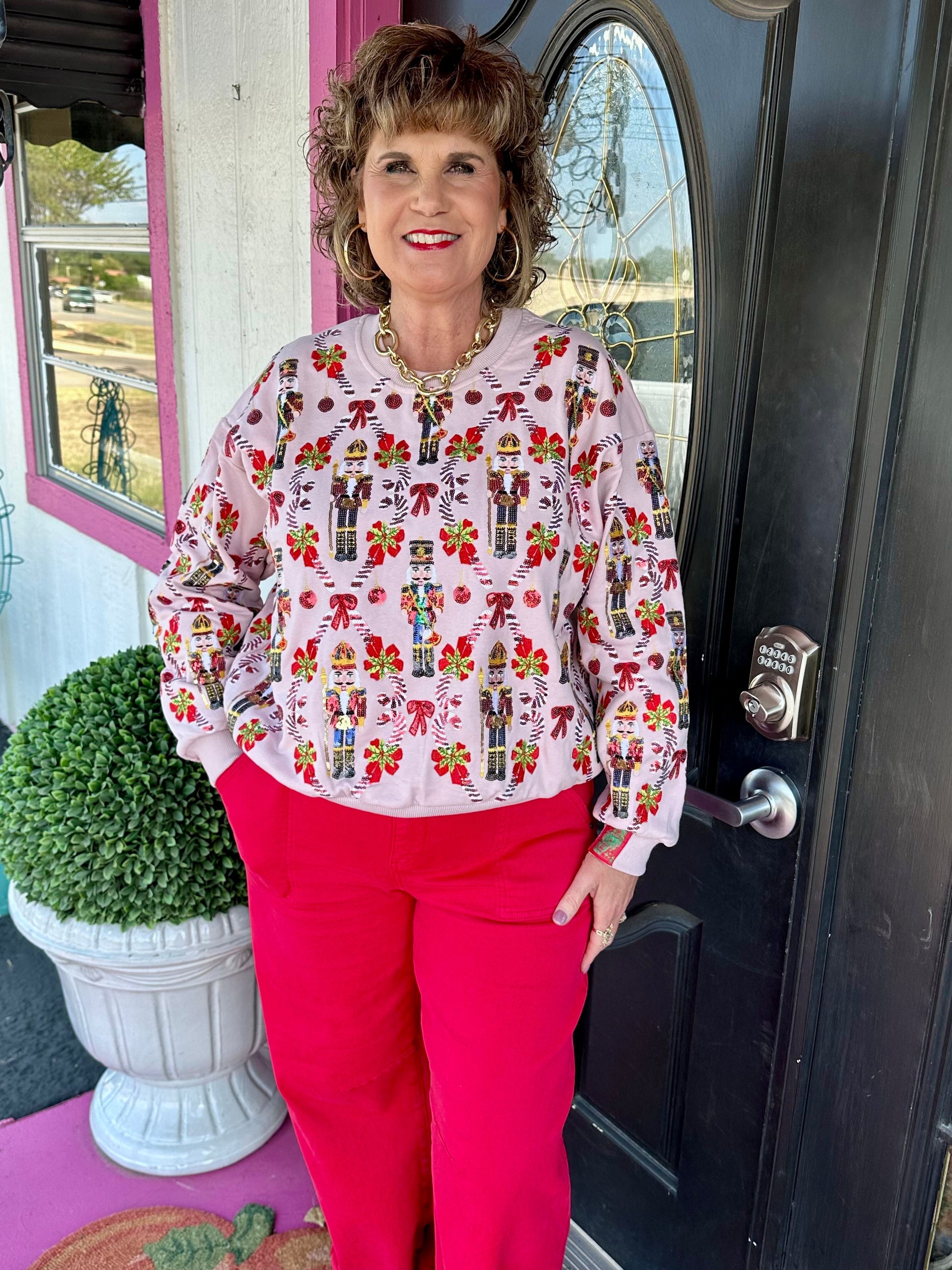 Embrace your inner Queen of Sparkles with this light pink sweatshirt adorned with charming Nutcracker and Candy Cane designs on front and back. Cozy and soft, it ensures all-day comfort while adding a festive pop of fun to your winter style. Perfect for those who love a playful holiday vibe!