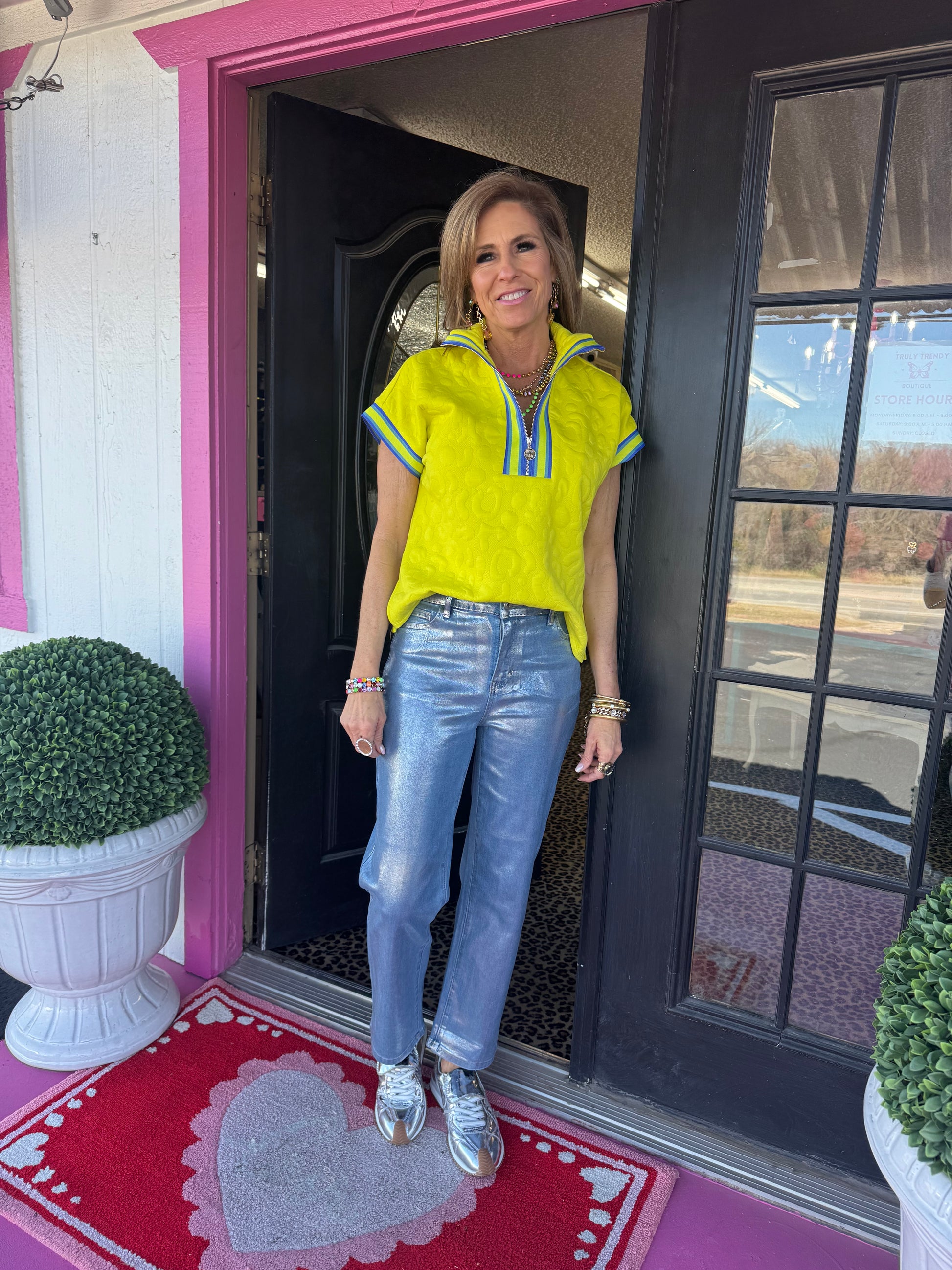 Introducing our Poppy Key Lime Cheetah Pullover! This playful top features a quilted jacquard cheetah design in a vibrant key lime color, accented with blue knit trim. Made with 98% polyester and 2% spandex, this pullover is both comfortable and stylish. Perfect for adding a touch of fun to any outfit!