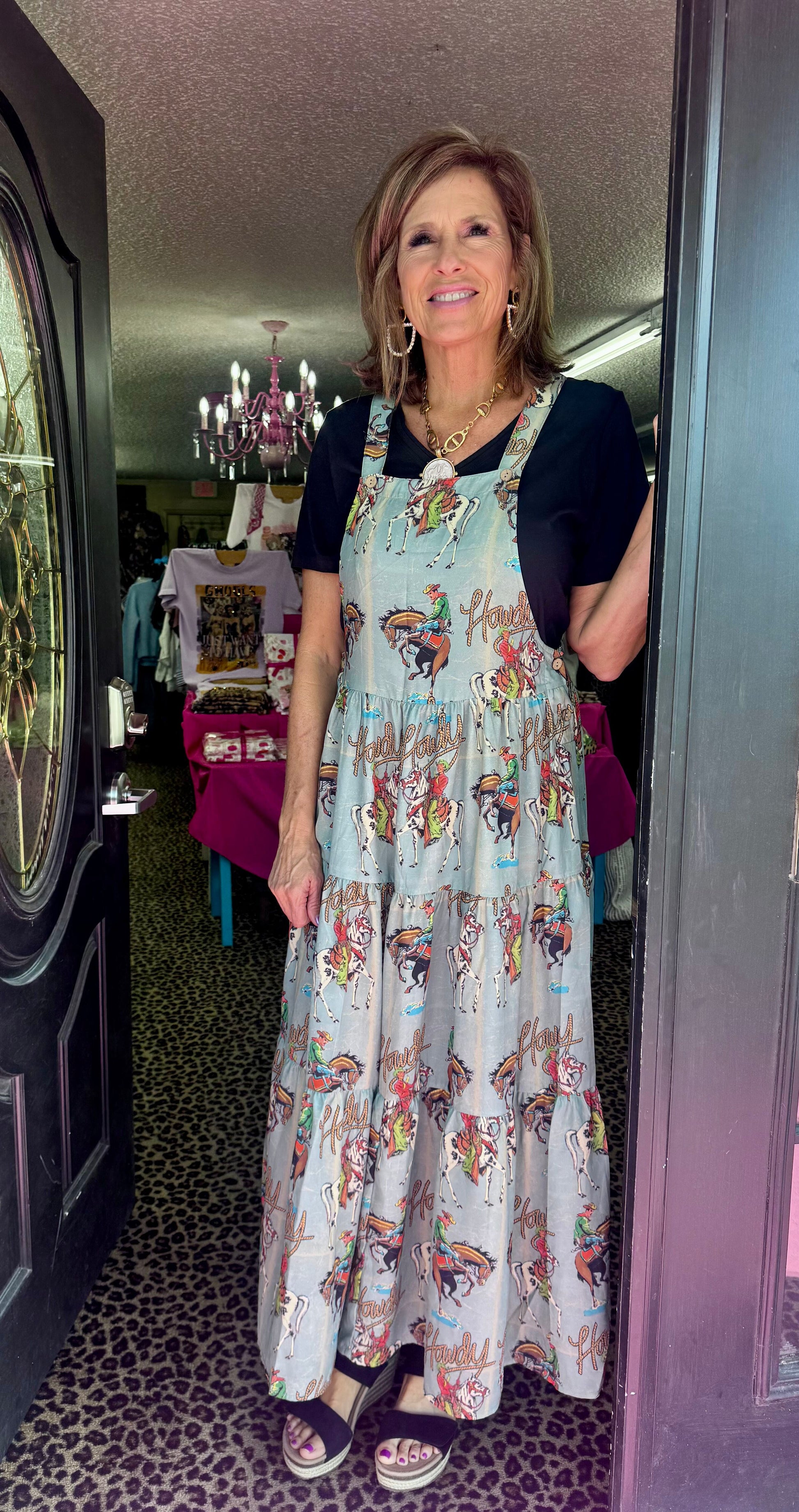 The Sage Howdy Overall Dress brings a playful Western charm with its all-over print of cowboys, horses, and cheerful "Howdy" text. Its square neckline and adjustable buttoned straps offer a customizable fit, while the tiered, maxi-length design creates a breezy, voluminous silhouette. Relaxed and flowy, this A-line dress pulls on easily for effortless casual or boho-inspired style with a fun, rustic twist.
