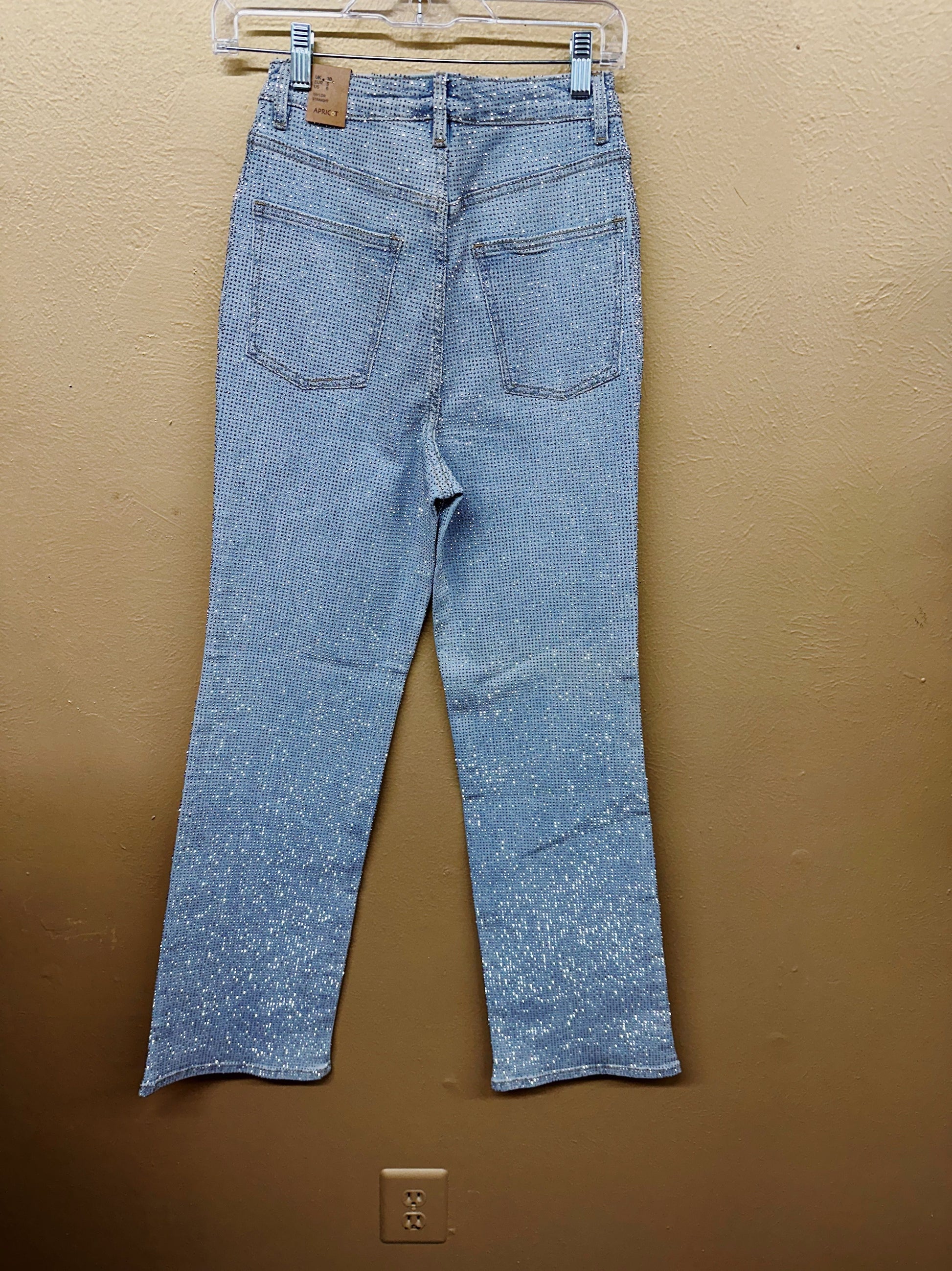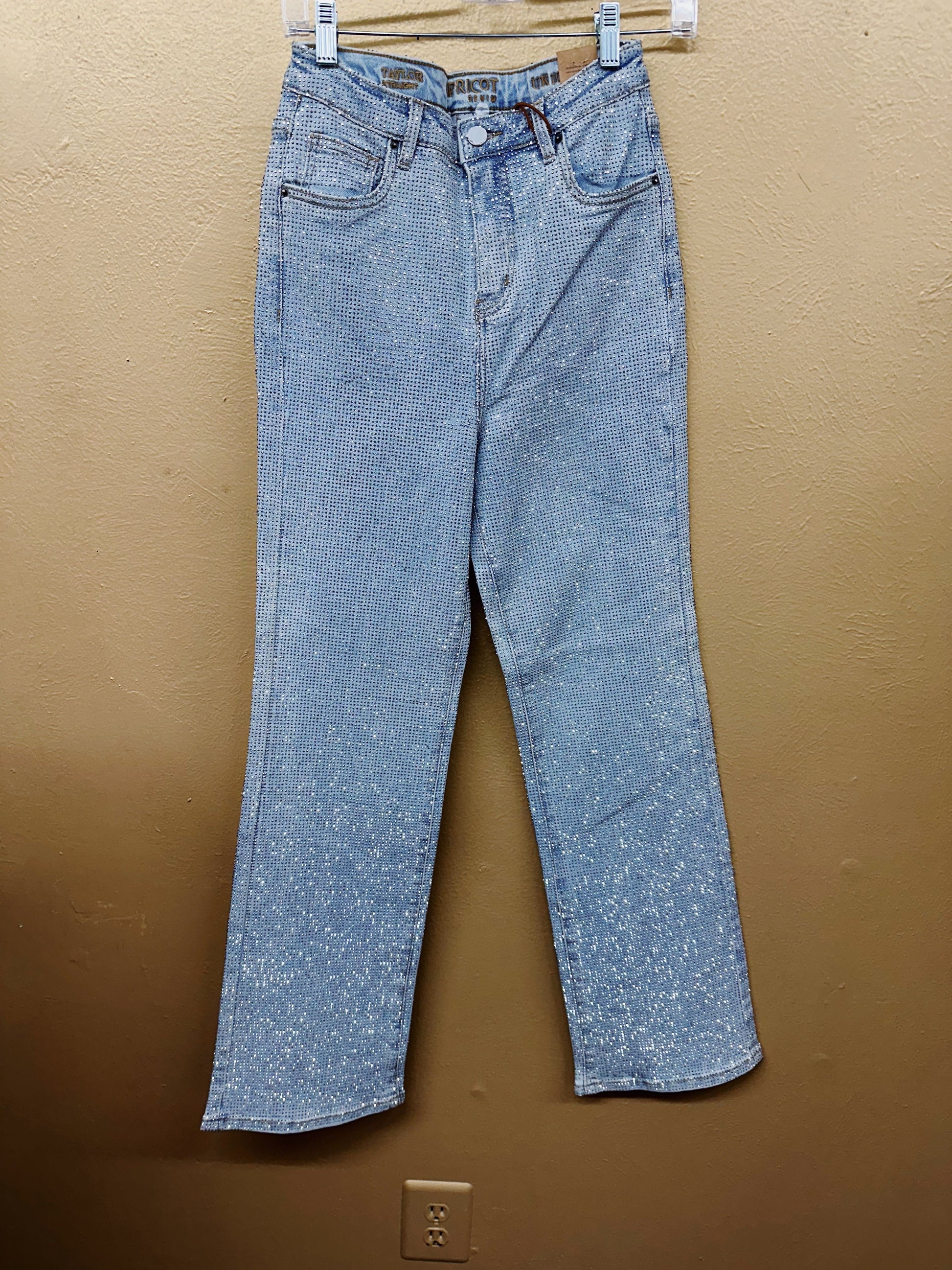 Add sparkle to your casual look with the Sky Swifty Straight Rhinestone Jean. These light blue denim jeans feature a straight leg cut and dazzling rhinestone embellishments for a fun, eye-catching twist. Perfect for turning everyday outfits into something uniquely you! Fully covered in rhinestones.